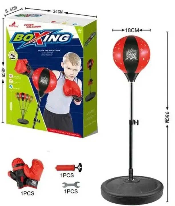 Чудовий боксерський набір для Вашої дитини! Він складається з груші діаметром 22 см, яка кріпиться на стійку висотою 102 см, також тут Ви знайдете відмінні рукавички для боксу з шкір-заступника. Даний снаряд служить для відпрацювання швидких і точних ударів. Може використовуватися в приміщенні і на вулиці. Призначений для дітей старше 4-х років.