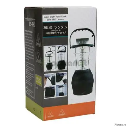 Світлодіодний ліхтар з 5 способами заряджання  ;і з 36-ма яскравими LED світлодіодами забезпечують рівномірне освітлення в радіусі 15-20 метрів. Заряджається від сонячної батареї протягом 6 годин і після чого час його роботи складе 6 годин, також живиться від мережі 220V, прикурювача автомобіля 12V.  або може працювати 30 годин від трьох батарей типу ААА. Динамо ліхтар, працює від ручного генератора, для цього є спеціальна ручка. Навколо скляної колби йде захисна решітка, що робить лампу абсолютно безпечною для використання в побуті.