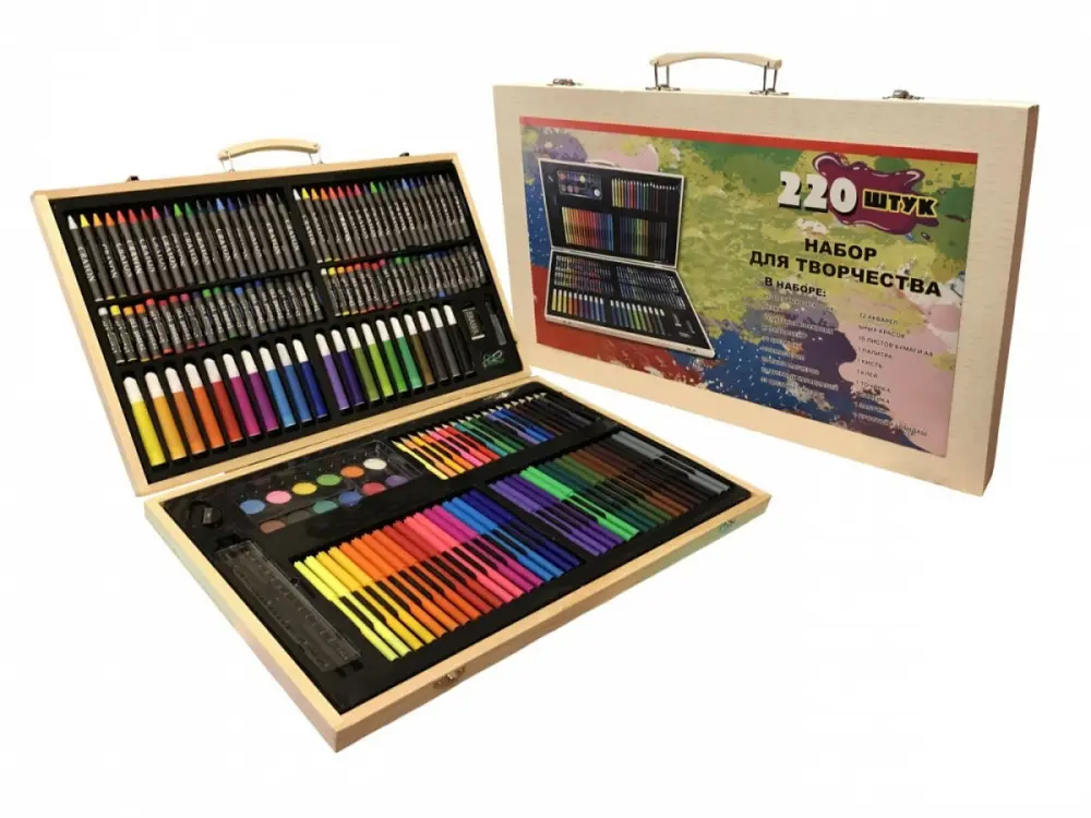 Великий дитячий набір для малювання та творчості, художній набір 220 предметів у дерев’яній валізці