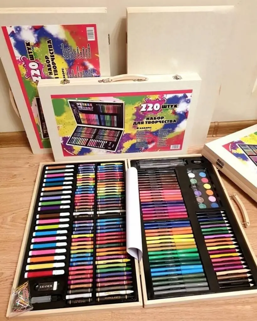 - Малювання , як творчий процес, розвивають: терпіння, увага, навички планування. У дитини правильно виявляться стриманість та твердження, вміння спілкуватися з людьми та правильно орієнтуватися у соціальній сфері. Це знадобиться в житті і принесе неоціненну користь. Важко уявити, чого в такому елегантному і великому наборі може не вистачати, особливо дитині. Недаремно цей комплект призначений для підростаючого покоління від 3 років і до повноліття. Чи не відмовляться від нього і захоплені дорослі люди. Малювання, спонукане таким подарунком, може розкрити в дітях неоціненні якості та позначитися на життєвому виборі занять. Випробуйте!